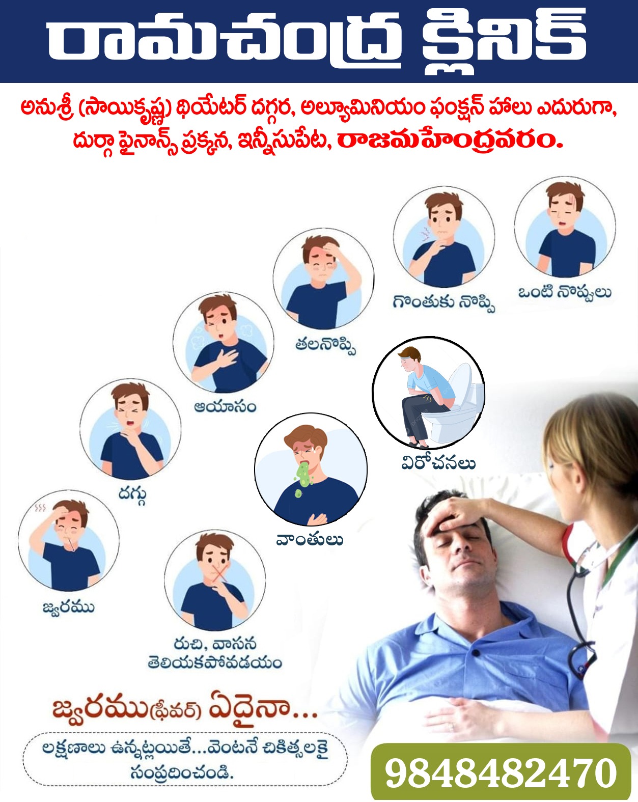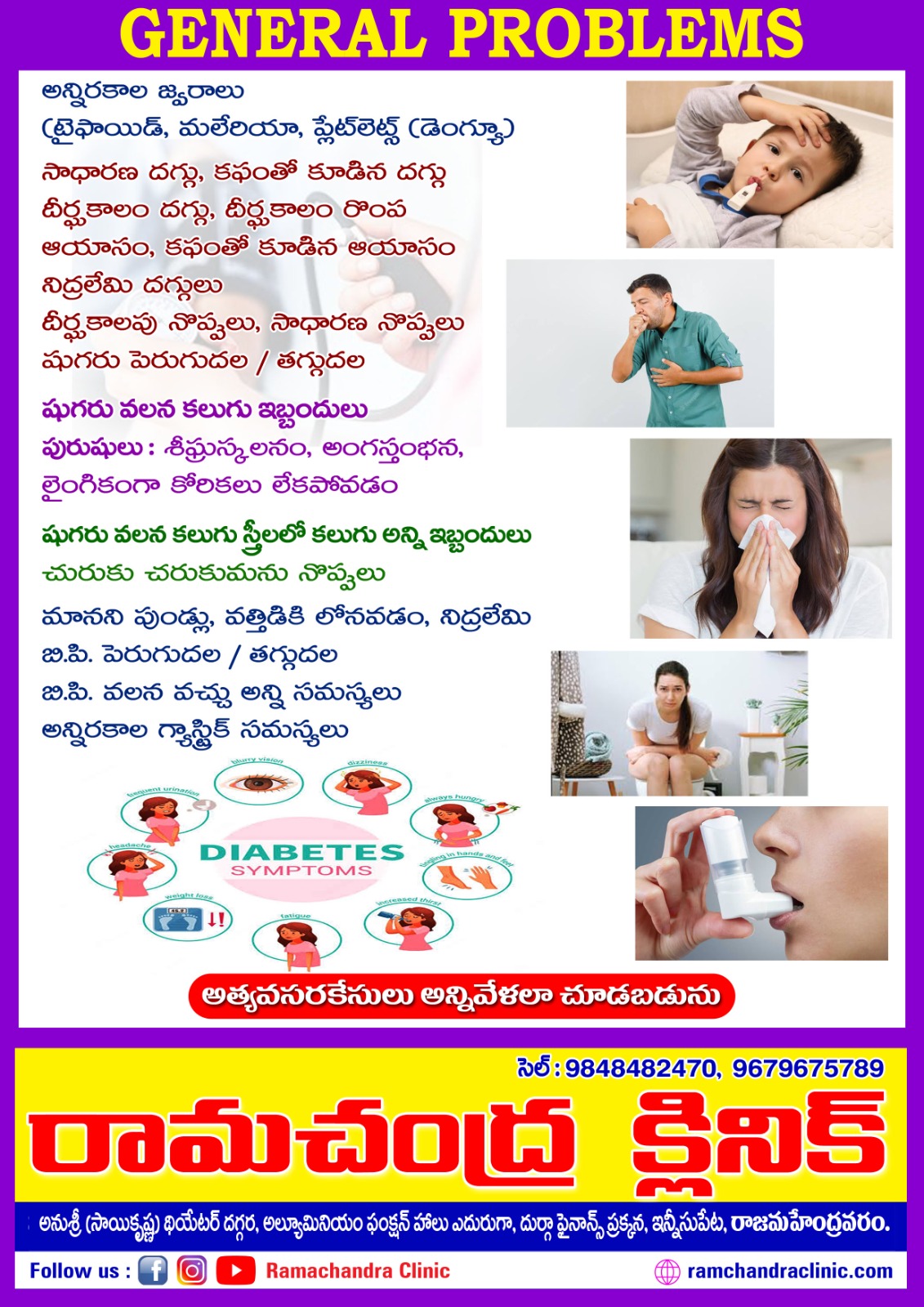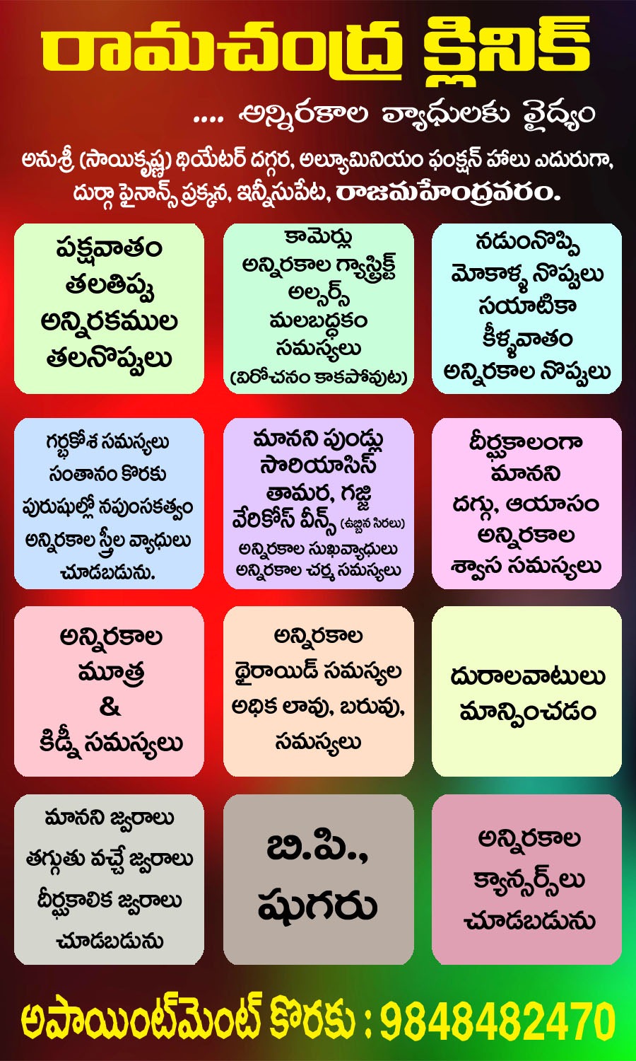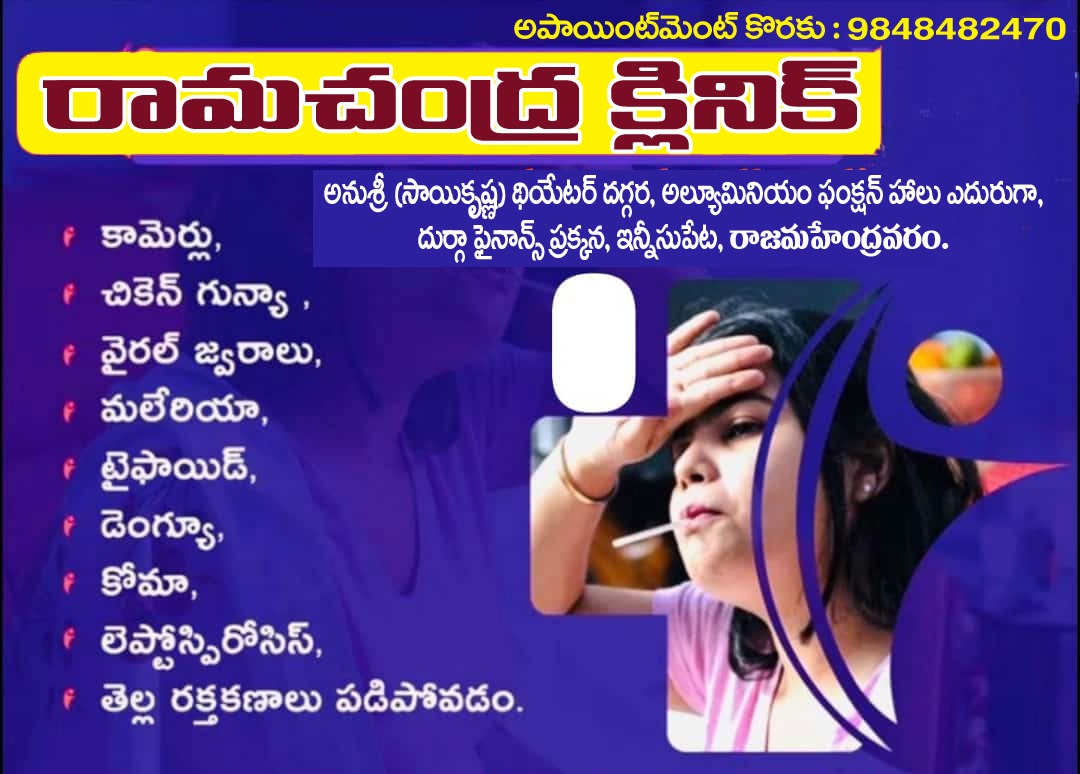 Make a appoinmentఅన్ని రకాల నొప్పులు, మధుమేహం, బీపీ, జ్వరం, చర్మ వ్యాధులు, గ్యాస్ట్రిక్ సమస్యలు, ఊపిరితిత్తుల సమస్యలు, మెదడు నరాలు, మానసిక, స్త్రీ వ్యాధులు, సంతానోత్పత్తి, అధిక బరువు స్థూలకాయ సమస్యలు మరియు అన్ని రకాల సాధారణ మరియు తీవ్రమైన వ్యాధులు చూడబడును.