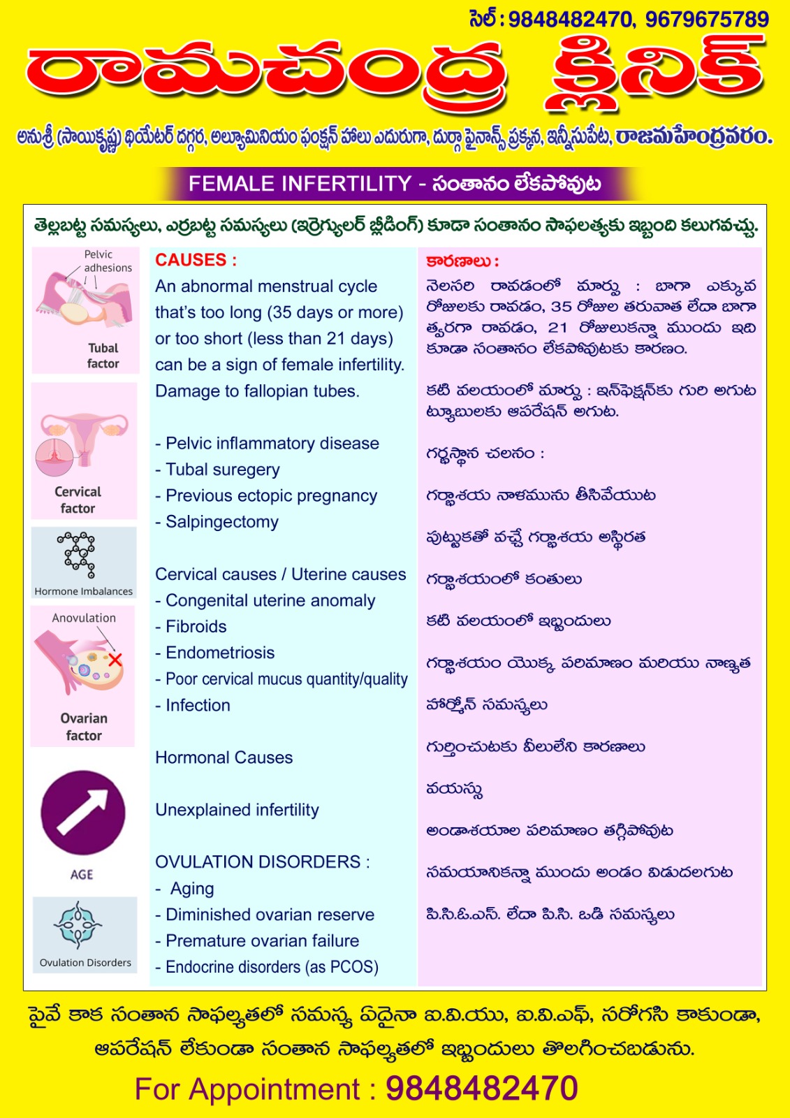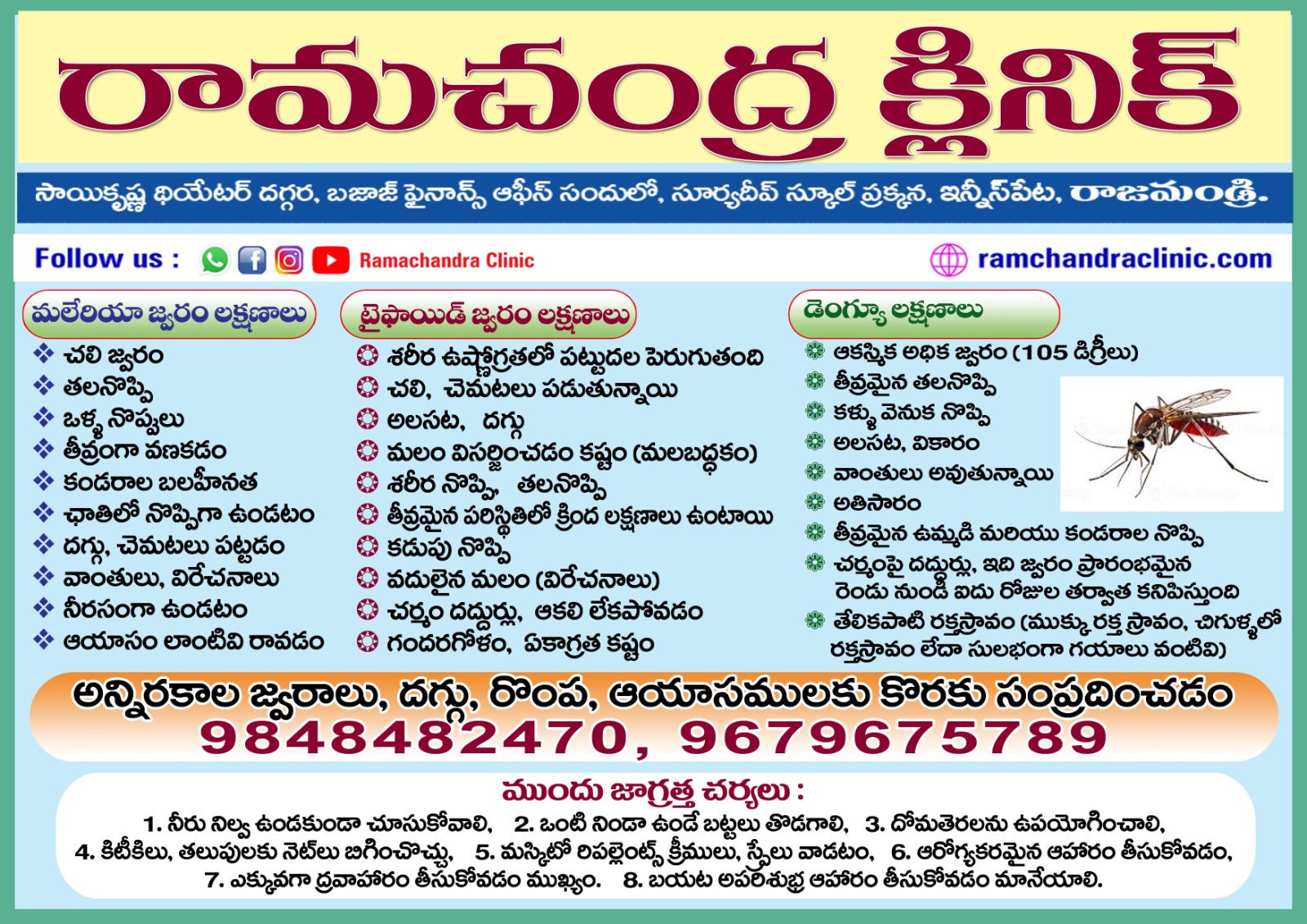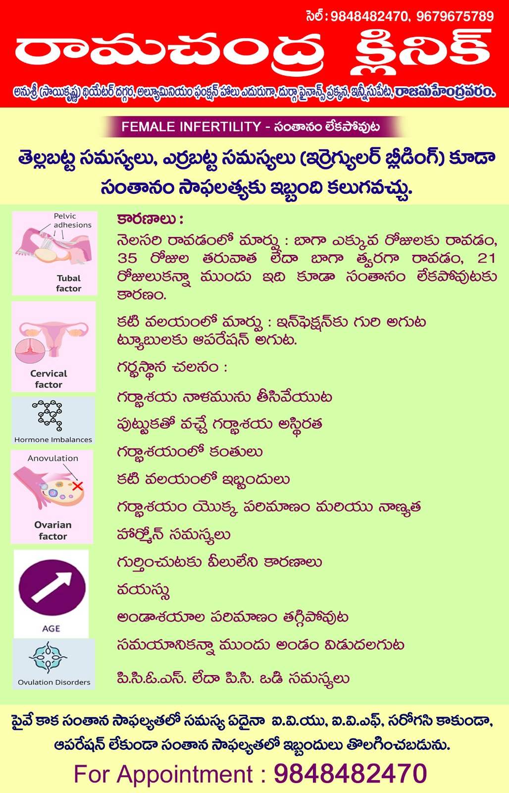 Make a appoinmentఅన్ని రకాల నొప్పులు, మధుమేహం, బీపీ, జ్వరం, చర్మ వ్యాధులు, గ్యాస్ట్రిక్ సమస్యలు, ఊపిరితిత్తుల సమస్యలు, మెదడు నరాలు, మానసిక, స్త్రీ వ్యాధులు, సంతానోత్పత్తి, అధిక బరువు స్థూలకాయ సమస్యలు మరియు అన్ని రకాల సాధారణ మరియు తీవ్రమైన వ్యాధులు చూడబడును.